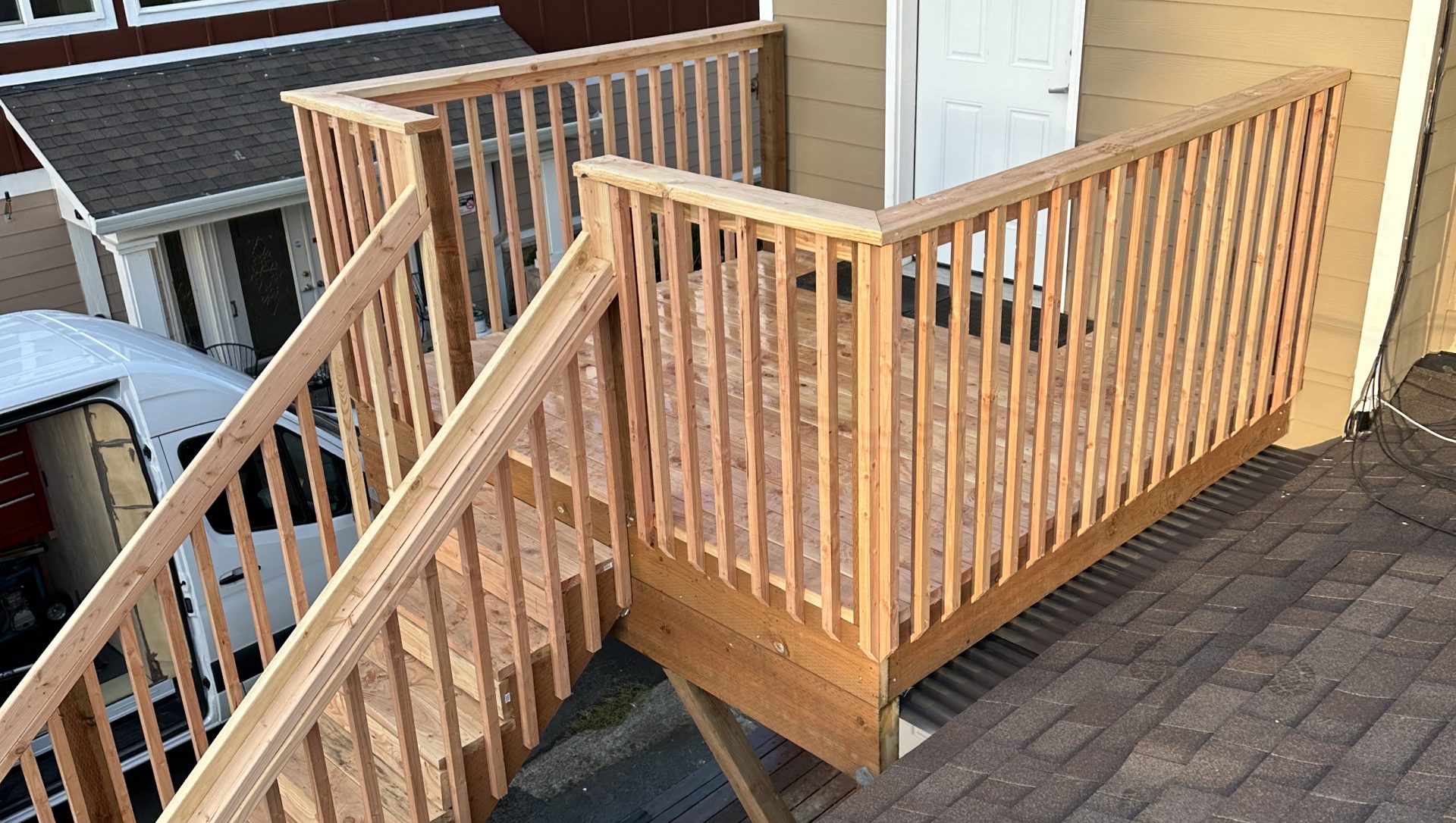 A full rebuild of a 100 sq. ft. elevated cedar deck with a 15 ft staircase, completed in 3 days. The project replaced an unsafe, rotting structure with a sturdy, beautiful new deck built for long-term use.