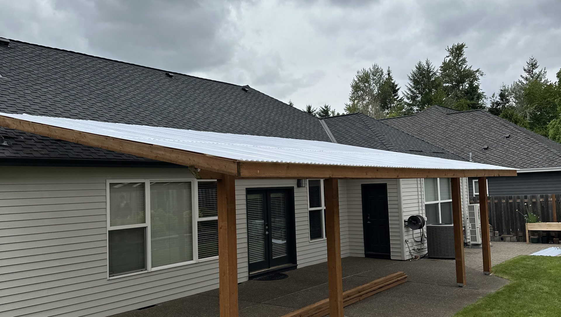 We created a spacious cedar patio cover with a polycarbonate roof system that balances light and shade. Thanks to proper bracket engineering, the structure stays leak-free and withstands heavy Oregon rain.